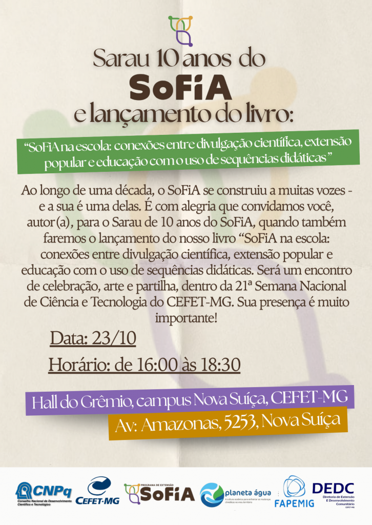 O programa SoFiA está completando 10 anos de existência! Para celebrar esse marco e relembrar os momentos vivenciados durante esses anos, convidamos você para o nosso Sarau comemorativo, onde também ocorrerá o lançamento do nosso livro impresso: “SoFiA na escola: conexões entre divulgação científica, extensão popular e educação com o uso de sequências didáticas.” (E-book gratuito).
