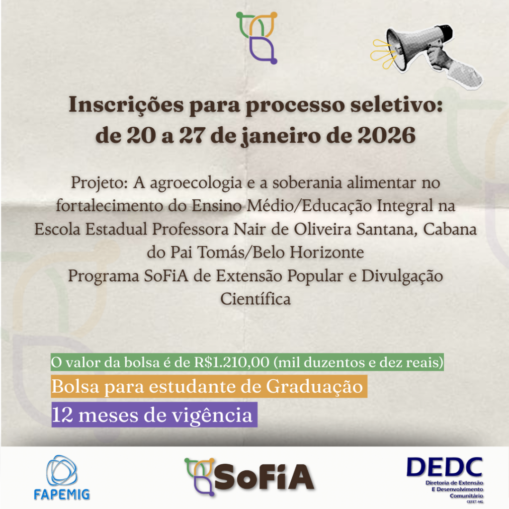 O Programa SoFiA (Programa SoFiA: extensão e divulgação científica na conexão de territórios, espaços escolares e saberes populares) torna público o edital de seleção de bolsista.
